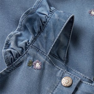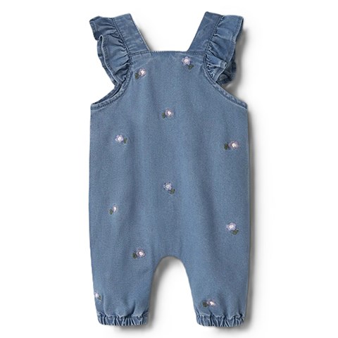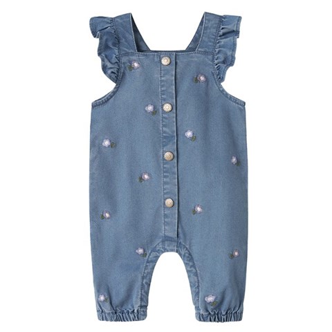 Sød denim jumpsuit med fint blomsterbroderi. Bukserne har flæsedetaljer og elastik i kanterne. Normal pasform.