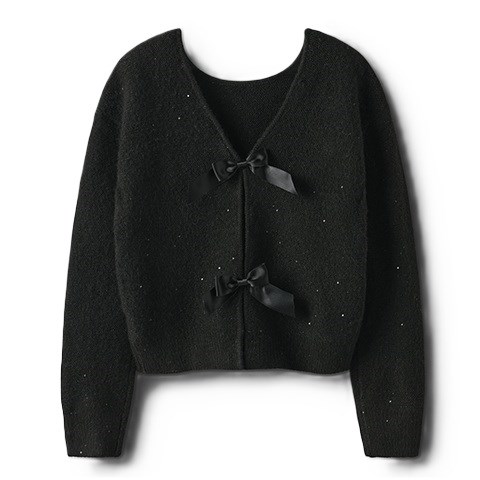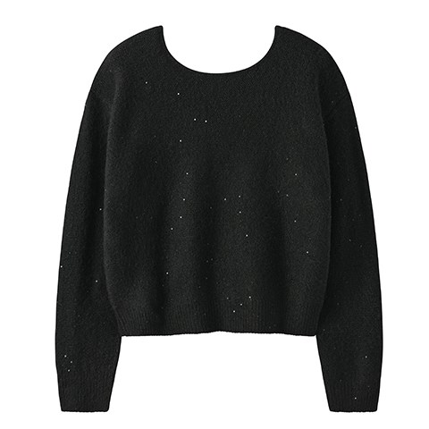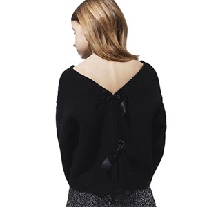 Kort strikket pullover med nedsænkede skuldre, pailletter, glitterdetaljer og sløjfedetaljer.