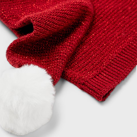 Strikket rød nissehue med glitter og fin hvid pom pom.