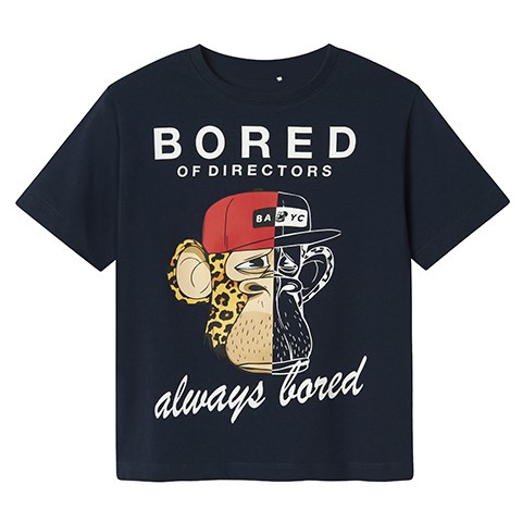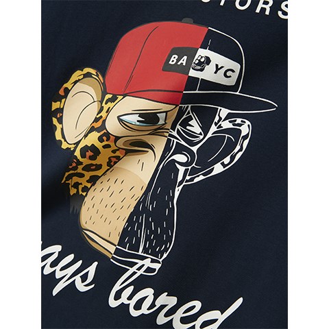 Cool t-shirt med print på forsiden med en af aberne i The Bored Ape Yacht Club (BAYC). T-shirten er lavet af jersey, som er et let og strækbart stof med en blød overflade og inderside, så den er behagelig at have på og giver god bevægelsesfrihed. Standard pasform.