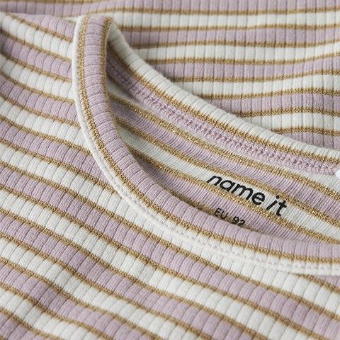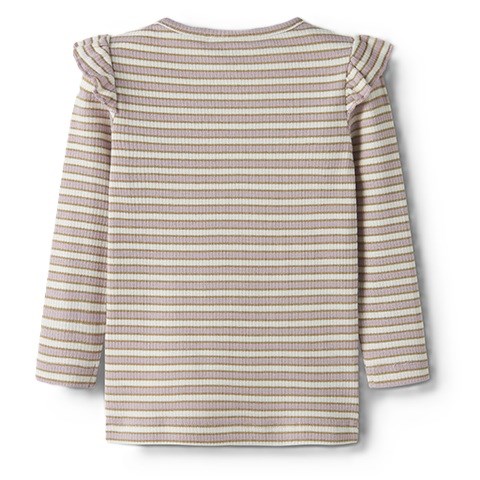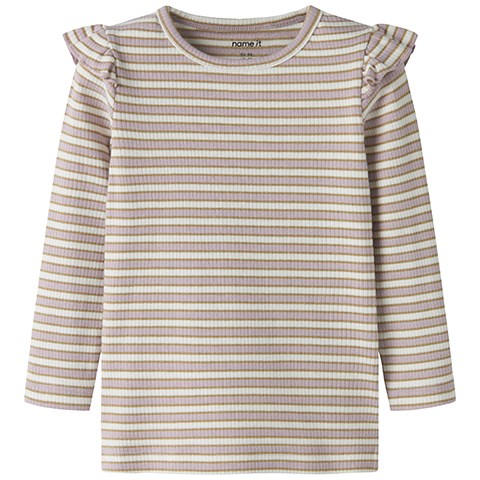 Stribet langærmet rib t-shirt med glimmer samt flæsedetaljer. T-shirten er fremstillet i ribkvalitet, så den har god elasticitet og er behagelig at have på. Slimfit pasform.