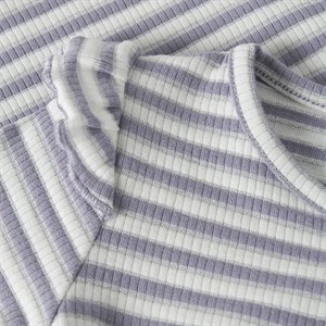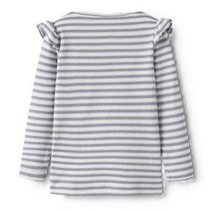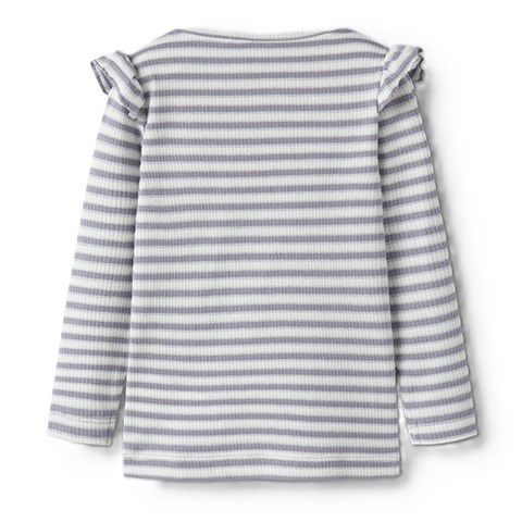 Stribet langærmet rib t-shirt med glimmer samt flæsedetaljer. T-shirten er fremstillet i ribkvalitet, så den har god elasticitet og er behagelig at have på. Slimfit pasform.