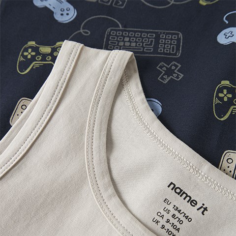 2 tank tops en med gamer print og en ensfarvet. De er fremstillet i jersey, som er et let og strækbart stof med en blød overflade og inderside, så de er behagelige at have på og giver en god bevægelsesfrihed.
