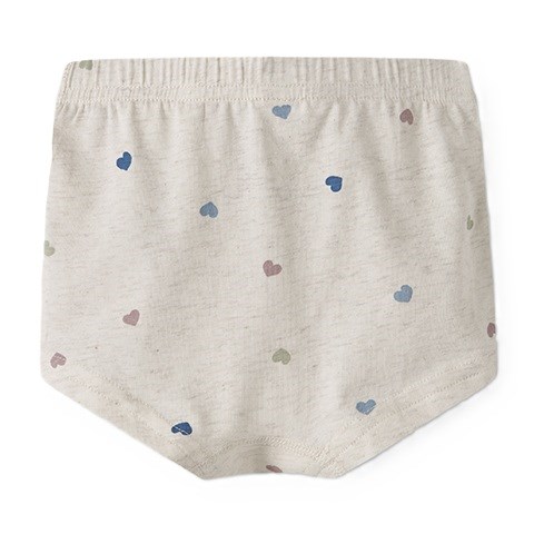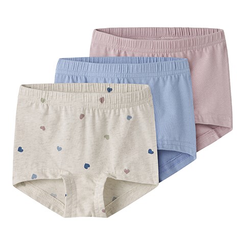 3 par underbukser med elastik i taljen. Det ene par er med hjerte print og de to andre er ensfarvede. Underbukserne er lavet i jersey, som er et let og strækbart stof med en blød overflade og inderside, så de er behagelige at have på og giver god bevægelsesfrihed.