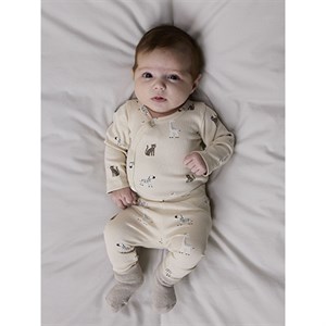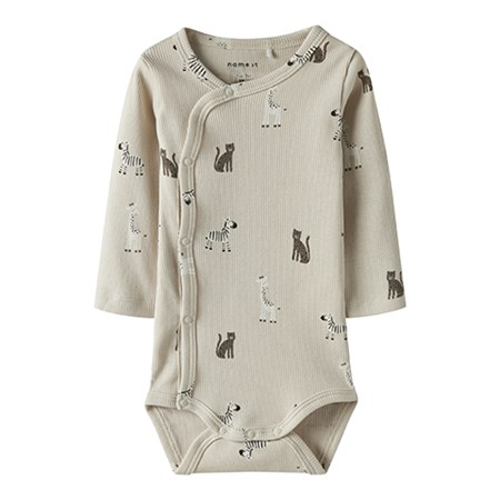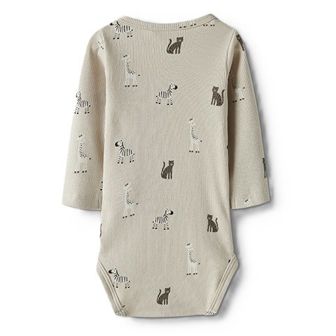 Blød langærmet slå-om rib body med print af dyr. Bodyen, som har trykknaplukning, er fremstillet i ribstrik, som har et lodret stribet mønster, og har god elasticitet, så den er behagelig at have på. Normal pasform.