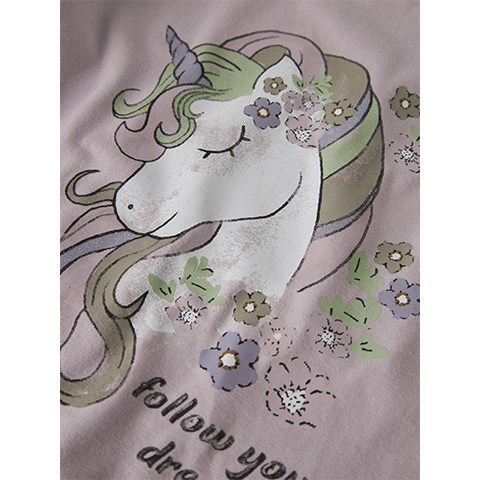 Langærmet t-shirt med print af enhjørning med glitter på forsiden. T-shirten er fremstillet i jersey, som er et let og strækbart stof med en blød overflade og inderside, så den er behagelig at have på og giver god bevægelsesfrihed.