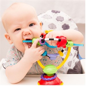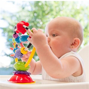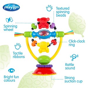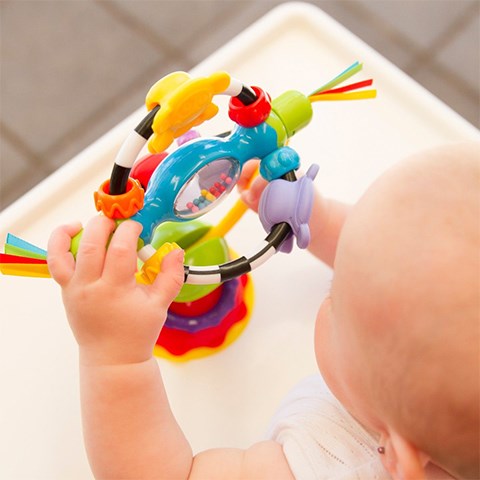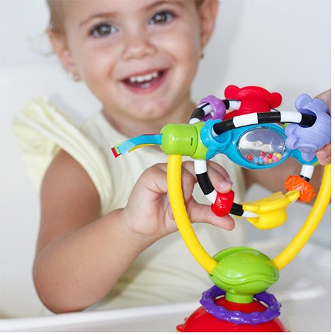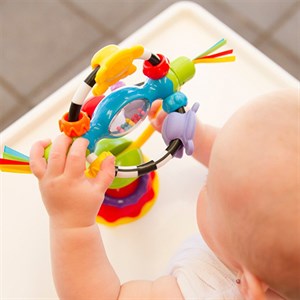 Sjov aktivitetsleg med sugekop for de allermindste. Når sugekoppen er fæstnet kan barnet slå til møllen, så den drejer rundt med alle de farvede dyr. Legetøjet kan også tages af sugekoppen, så skaber det nogle andre muligheder for legen. Her kan kastes og gribes, bides og rasles eller lade de farvede labels kilde én på hånden. Alletiders gave til babyen.