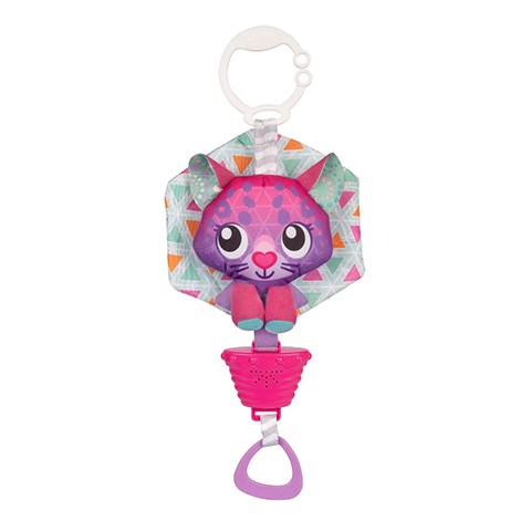 Træk ned i ringen på katten for at høre fire beroligende melodier. Blandingen af plys, vævet og hårde overflader stimulerer barnets sanser. Katten har C-clips, så den er nem at fastgøre til barnevogne, klapvogne, autostole og barnesenge. 2 x LR44 batterier medfølge. Alletiders gave til babyen.