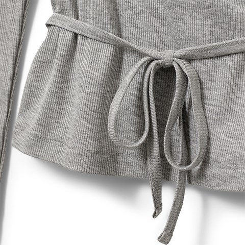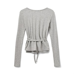 Blød langærmet slå-om bluse med V-udskæring og stofbånd i taljen. Blusen er fremstillet i stretchy viscose/spandex med fin ribstruktur.