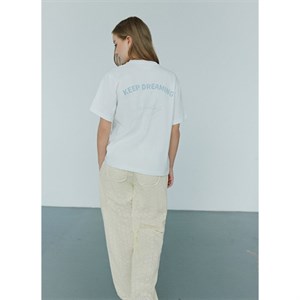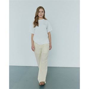 Fremstillet i 100% bomuld, der gør T-shirten blød, åndbar og perfekt til daglig brug. Den rene hvide farve gør det nemt at style med både jeans, nederdele og lag-på-lag outfits.