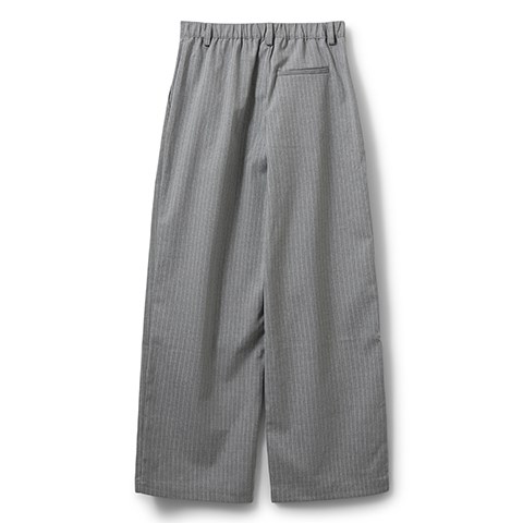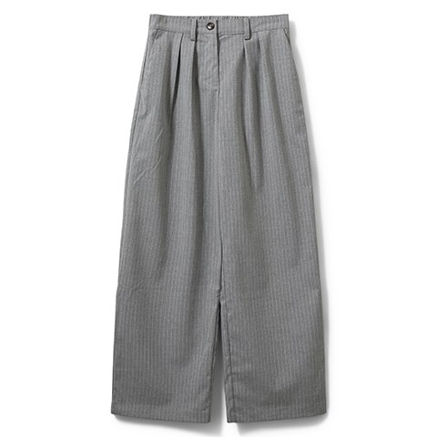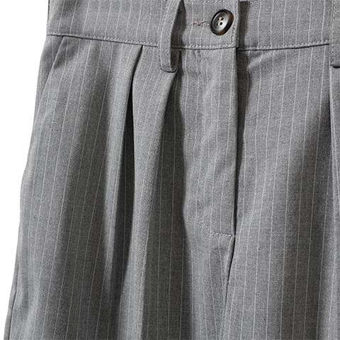 Cool grå bukser med nålestriber. Bukserne har lige ben med pressefolder samt side- og baglommer. Lynlås og knap foran.