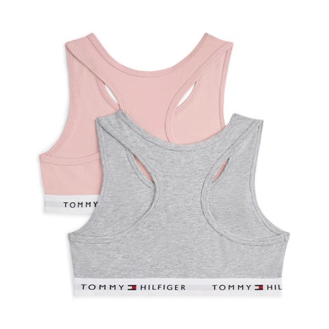 Disse 2 racerback braletter / toppe, en grå og en lyserød, er lavet af blødt strækbomuld med Tommy Hilfiger logo på elastikkanten. Braletterne er i pull-on design, og er upolstrede.