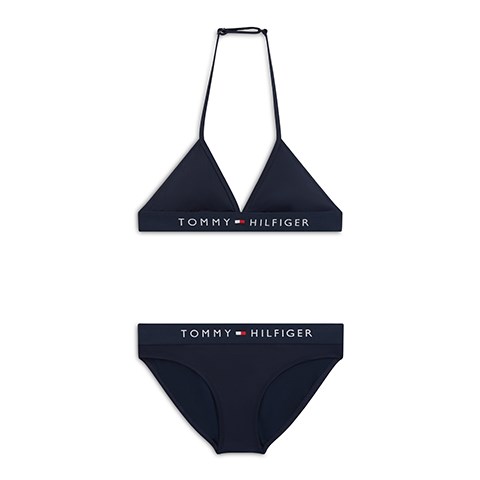 Triangle bikinisæt med justerbar halterneck-strop med spaghetti på bikini-toppen. Bikini-trussen har elastik i linningen. Både bikini-toppen og bikini-trussen har Tommy Hilfiger-logo i linningen. Bikinien er perfekt til sjove dage på stranden eller ved poolen. Strækbart nylon badetøj. Toppen er u-polstret og i pull-on design