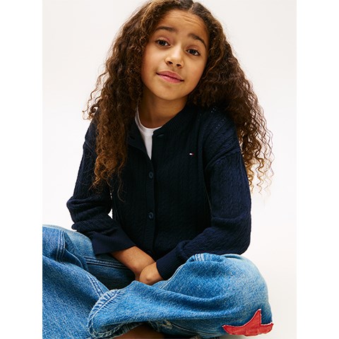 Klassisk cardigan i flot kabel-strik med knaplukning foran fra Tommy Hilfiger. Cardiganen har lille broderet flaglogo på brystet.