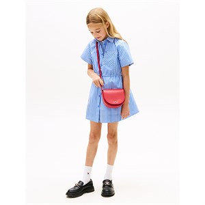 Sød stribet kortærmet skjortekjole med lille broderet flaglogo på brystet. Kjolen har knaplukning foran, brystlomme, skjortekrave, samt bindebånd i livet. Kort model, normal pasform.
