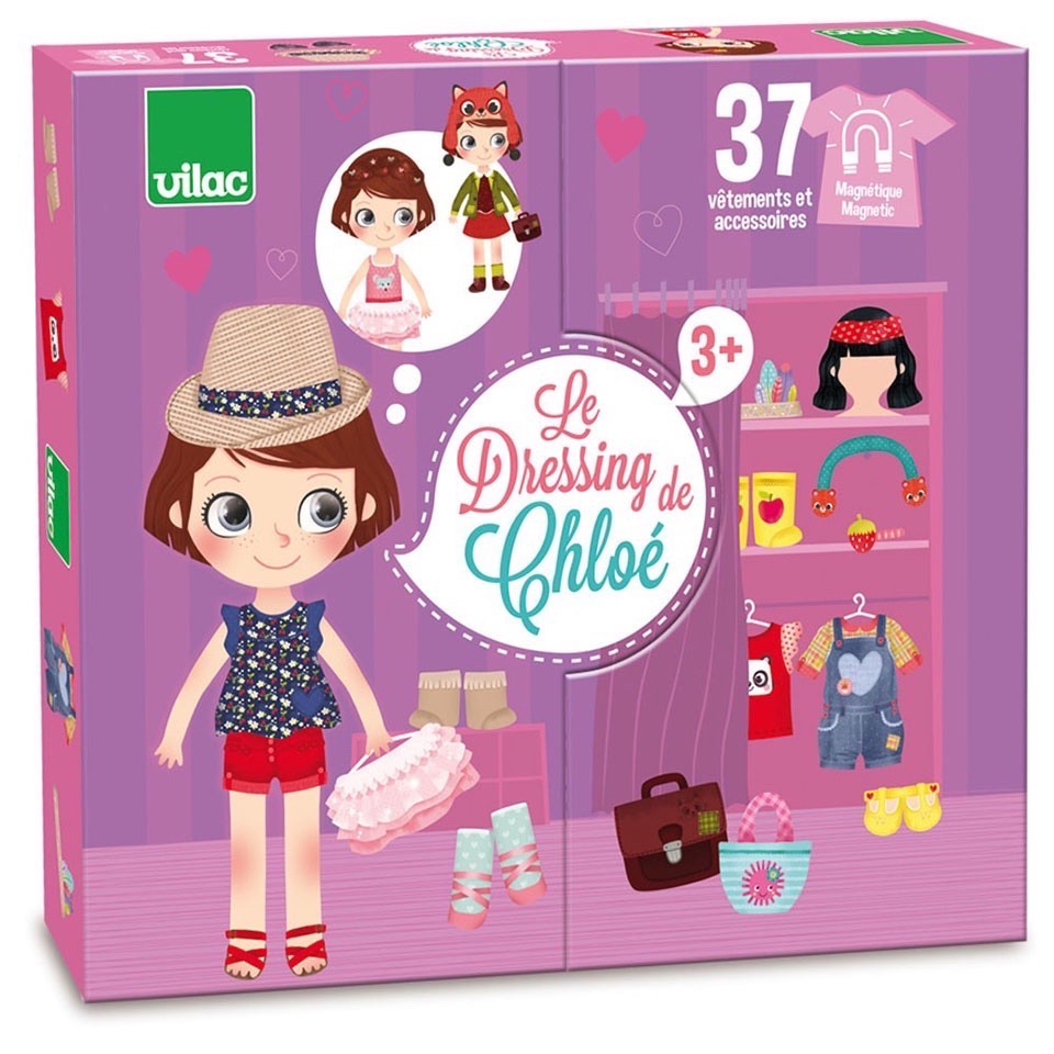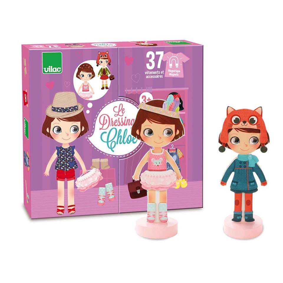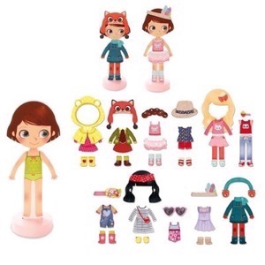 Påklædningsdukke i træ med fod, så hun selv kan stå op. Påklædningsdukken er magnetisk, så tøjet bliver siddende. Hun har flere smukke outfits både til sommer og til vinter, til skole og fritid. Sættet indeholder ialt 42 magnetiske dele: nederdele, kjoler, hatte og bukser, og så kan dukken også få skiftet frisurer.