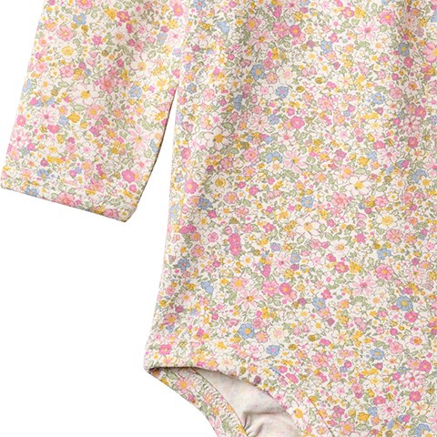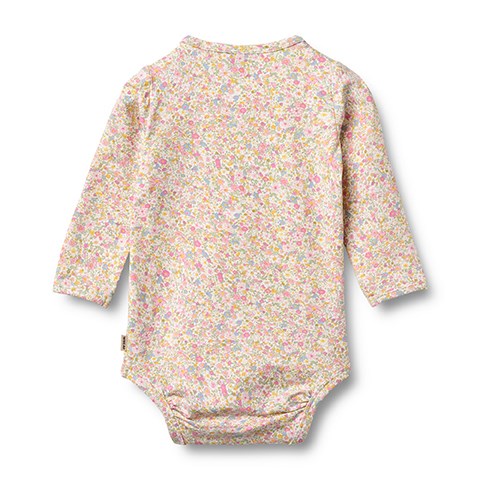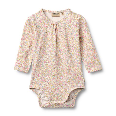 Langærmet body med blomsterprint i blød økologisk bomuldsjersey til babyer. Bodyen har rynker foran og trykknapper ved skulder og skridt. Normal/slim fit.
