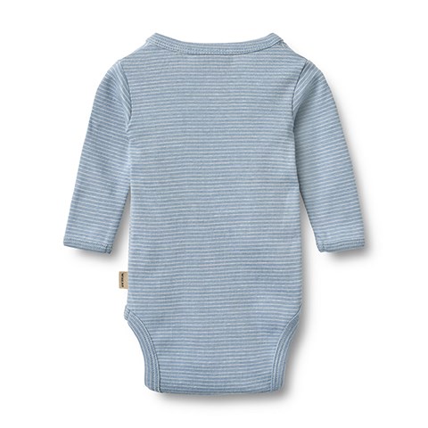 Langærmet stribet slå-om-body i blød økologisk bomuld til babyer. Bodyen har krydsåbning for lettere adgang, samt trykknapper i siderne og i skridtet.