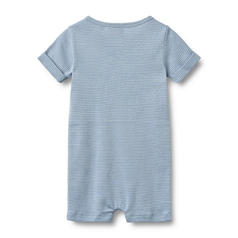 Blød stribet jumpsuit med korte ærmer og ben i økologisk bomuld. Bodyen har stolpe foran med to knapper, opsmøgede ærmer og trykknapper langs benenes inderside.