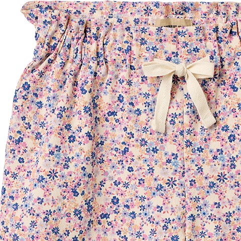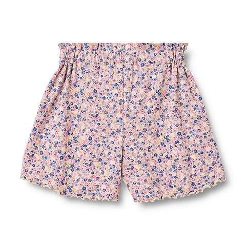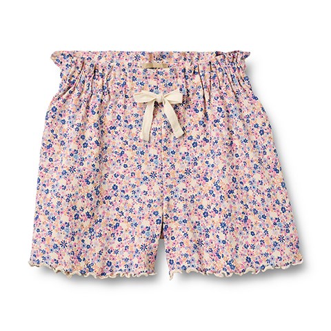 Blomsterprintede shorts med flæsedetaljer i blød økologisk bomuld til børn. Shortsene har masser af rynker og justerbar elastik i linningen med snøre. Wheats bløde shorts er fantastiske til de varme årstider med en løs pasform omkring benene, hvilket gør dem behagelige for dit barn at have på og lege i.