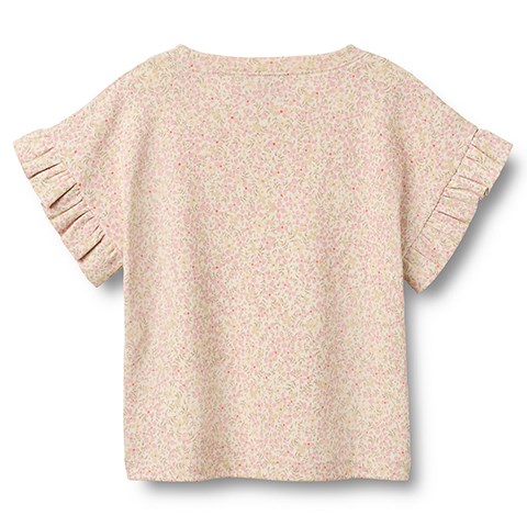 Kortærmet t-shirt med fint blomsterprint og flæsedetaljer. T-shirten er fremstillet af blød økologisk bomuld, der sikrer en behagelig og åndbar pasform til hverdagsburg. Løs pasform.
