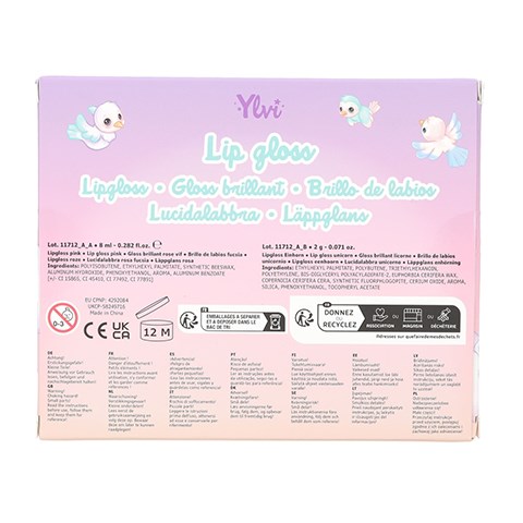 Det sødeste lipgloss-sæt fra Ylvi består af blåbærduftende lipgloss i tube (8ml) med regnbuefarvet pom-pom nøglering samt en lipgloss med sød æbleduft (2 g) i form af en enhjørning donut. Sættet er pakket i den fineste gaveæske, og er perfekt som gave.